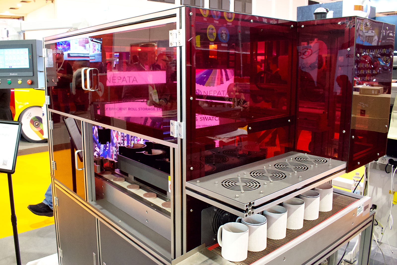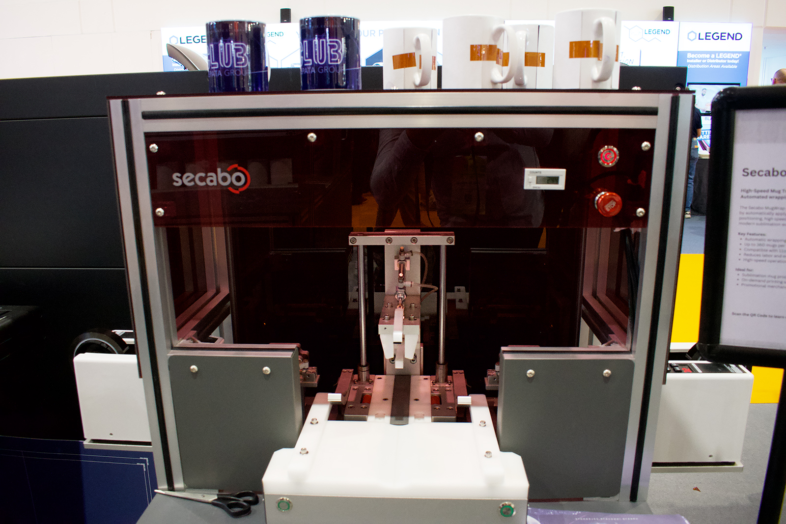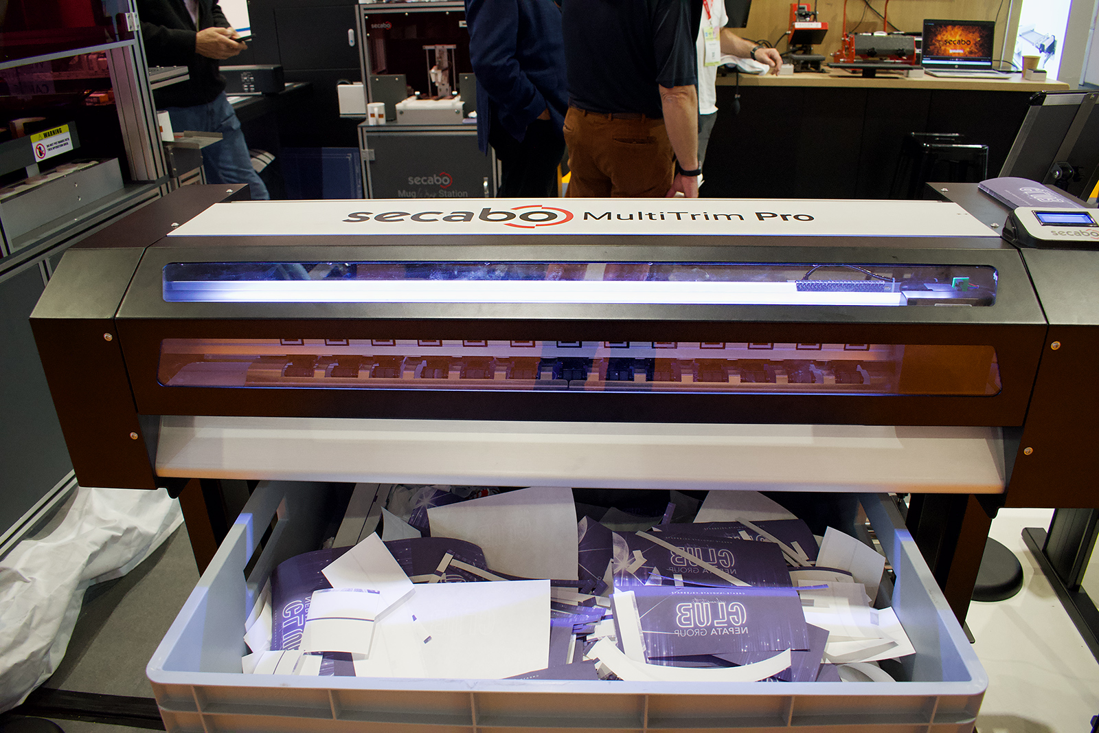 Intill står också Secabo MultiTrim Pro som är en lösning för exakt trimning av DTF-transfer, muggomslag och annat transfermaterial i rullform. Den har ett intelligent filmspårningssystem som kontinuerligt övervakar filmens position under drift.