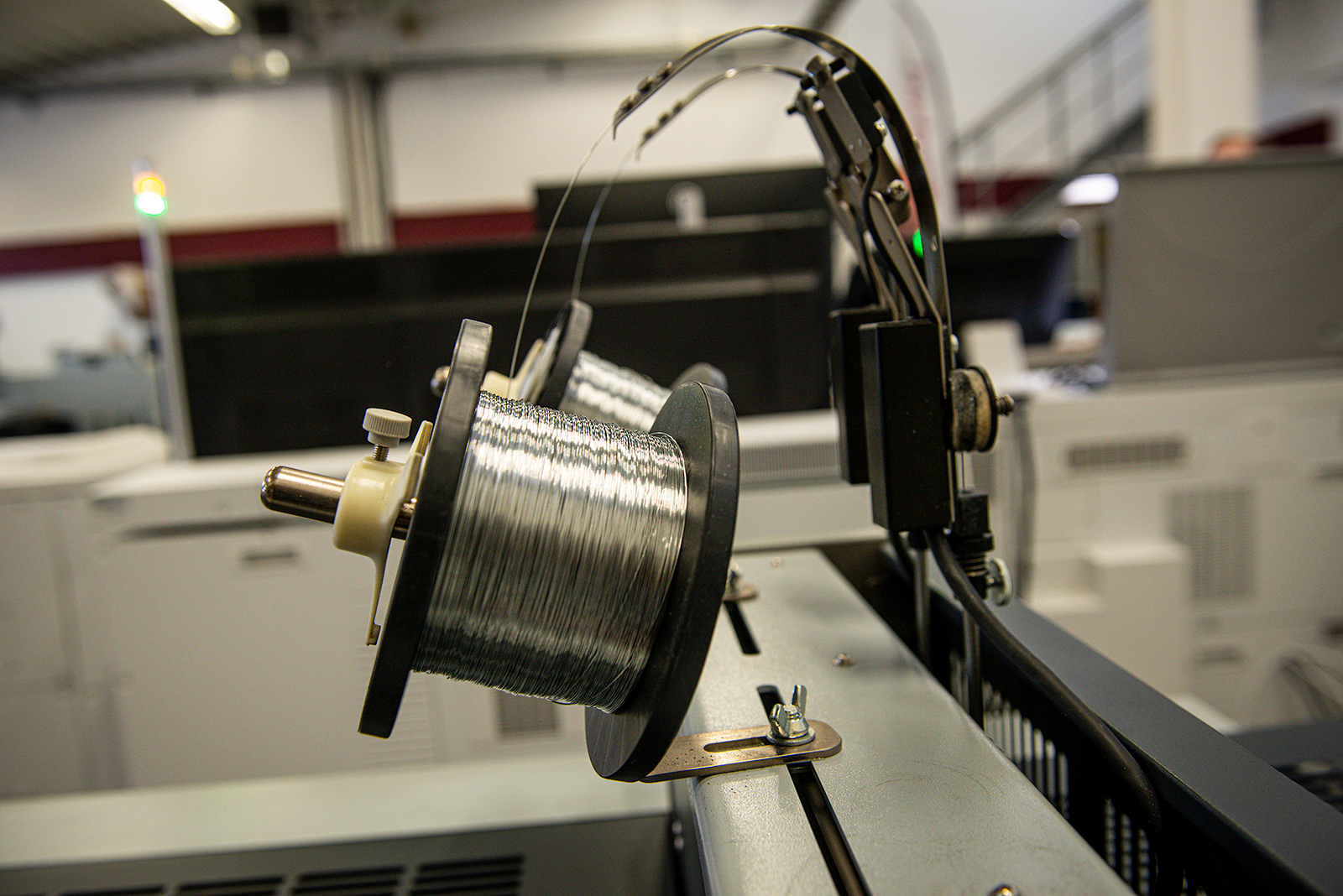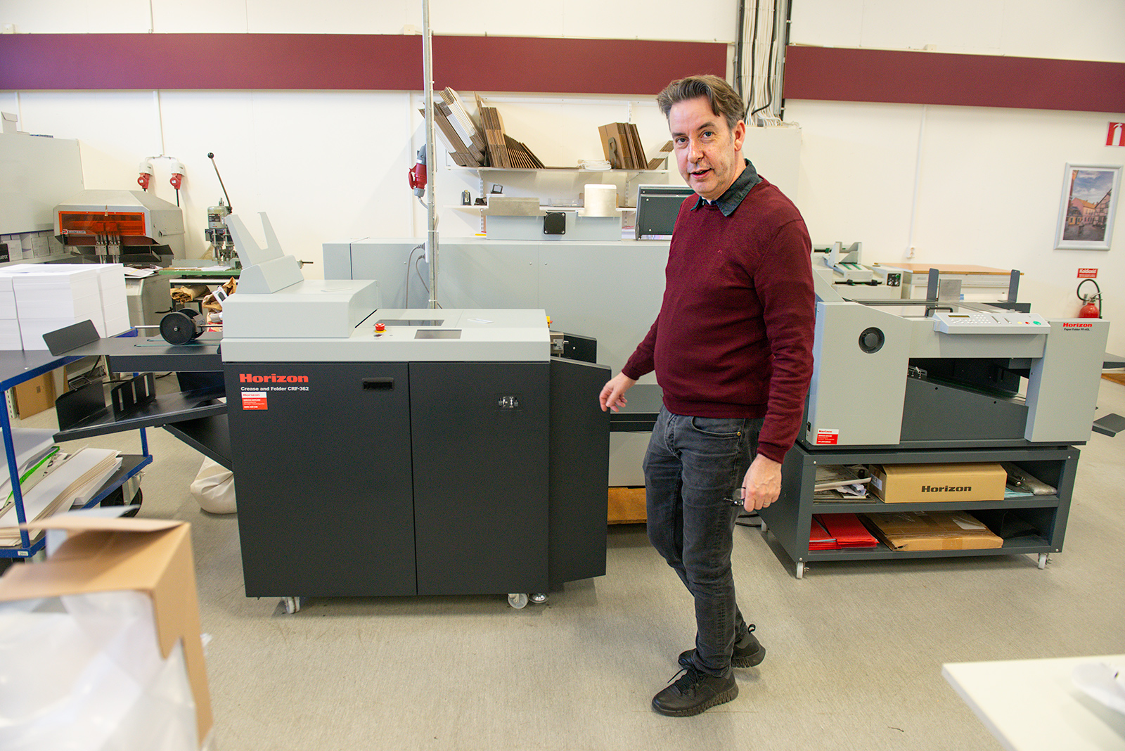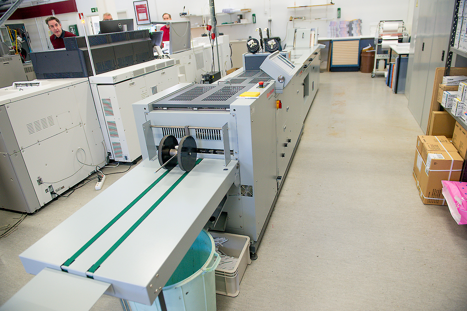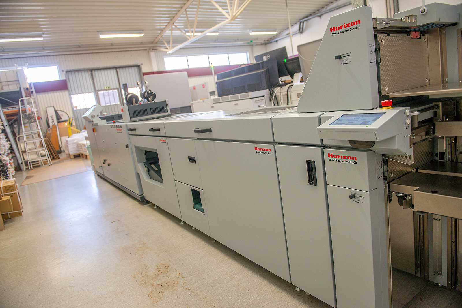 Tryckeriet har investerat i en ny broschyrlinje från Horizon som står intill Canonpressen. Den används för att sortera ark, klammerhäfta, falsa och skära. Häften och broschyrer kommer ut färdiga ur linjen.