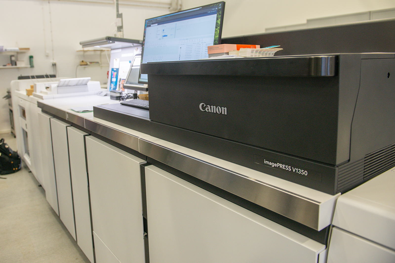 Canonpressen V1350 har de haft i tre månader och Canon är också en ny leverantör för tryckeriet. Tidigare har de haft Ricoh men den tidigare maskinen hade nåt vägs ände. Den nya pressen är en av Canons snabbaste tonermaskin.