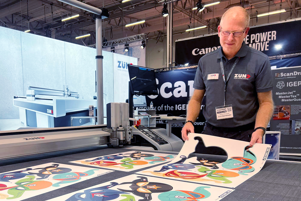 På Sign&Print Scandinavia visar Zünd hur mjukvaruuppdateringen och OCC-kameran tillsammans kan identifiera arkets exakta position och därefter skära ut olika motiv som skrivits ut på samma material.