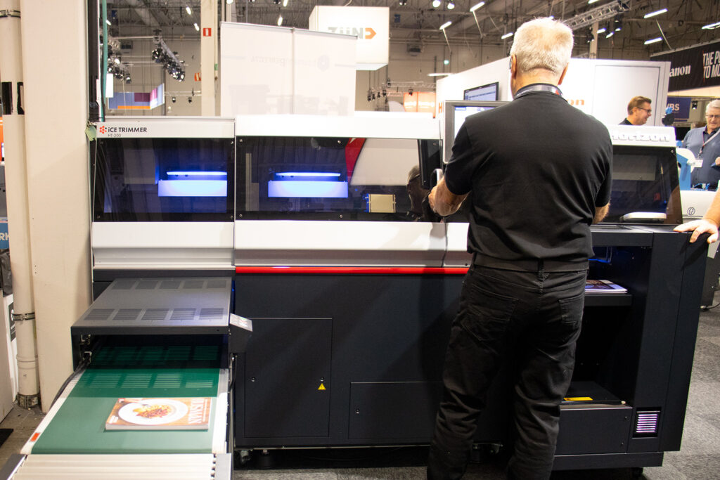 I bokproduktionslinjen finns flera nyheter. Maskiner som premiärvisades på Drupa förra året och som nu ställs ut på en svensk mässa för första gången. Det handlar bland annat om limbindningsmaskinen iCE BINDER BQ300.
