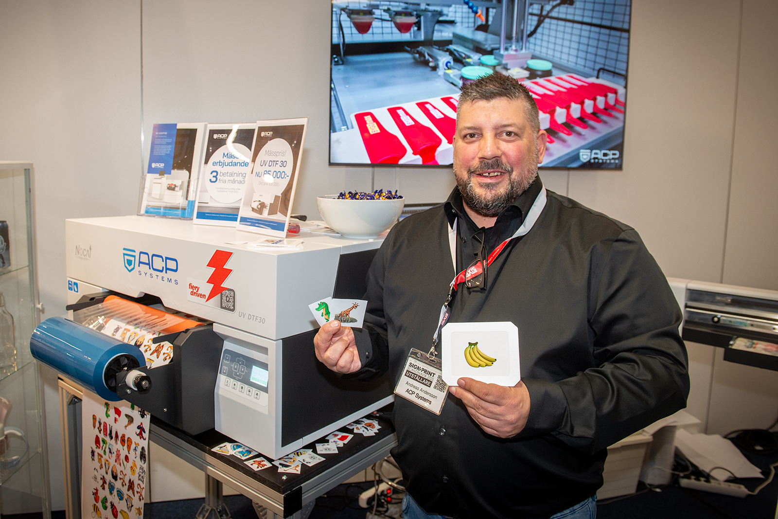 Andreas Andersson på ACP Systems visade upp deras nya dekalskrivare med UV-DTF-teknik.