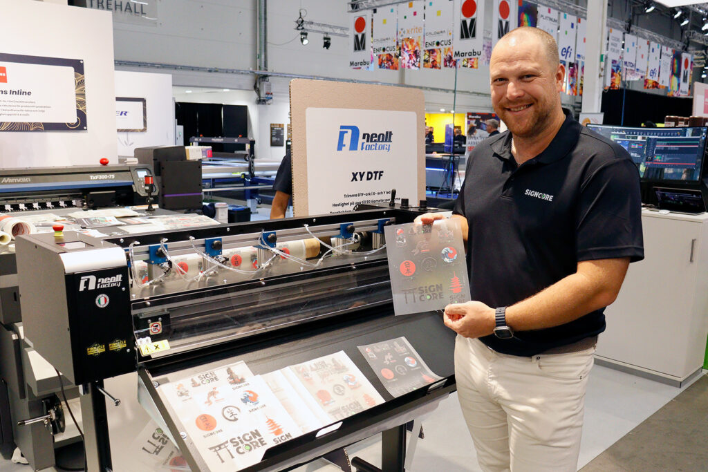 Precis innan mässan blev det klart att Signcore börjar sälja en XY-trimmer för DTF från italienska Neolt. Det har också varit ett dragplåster i montern.