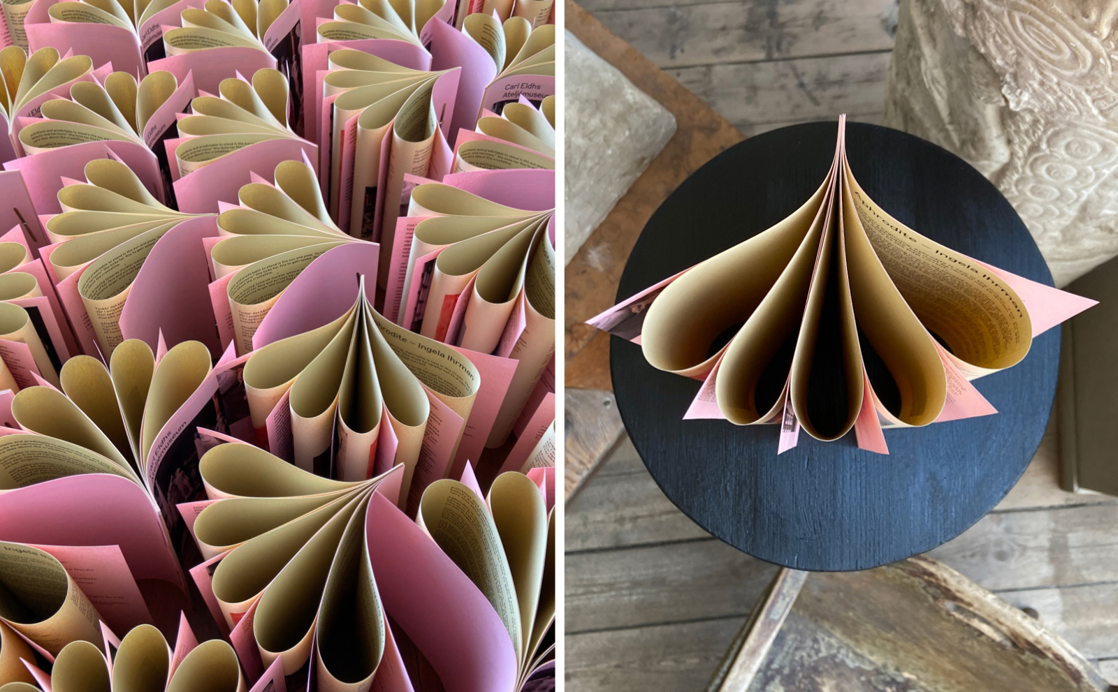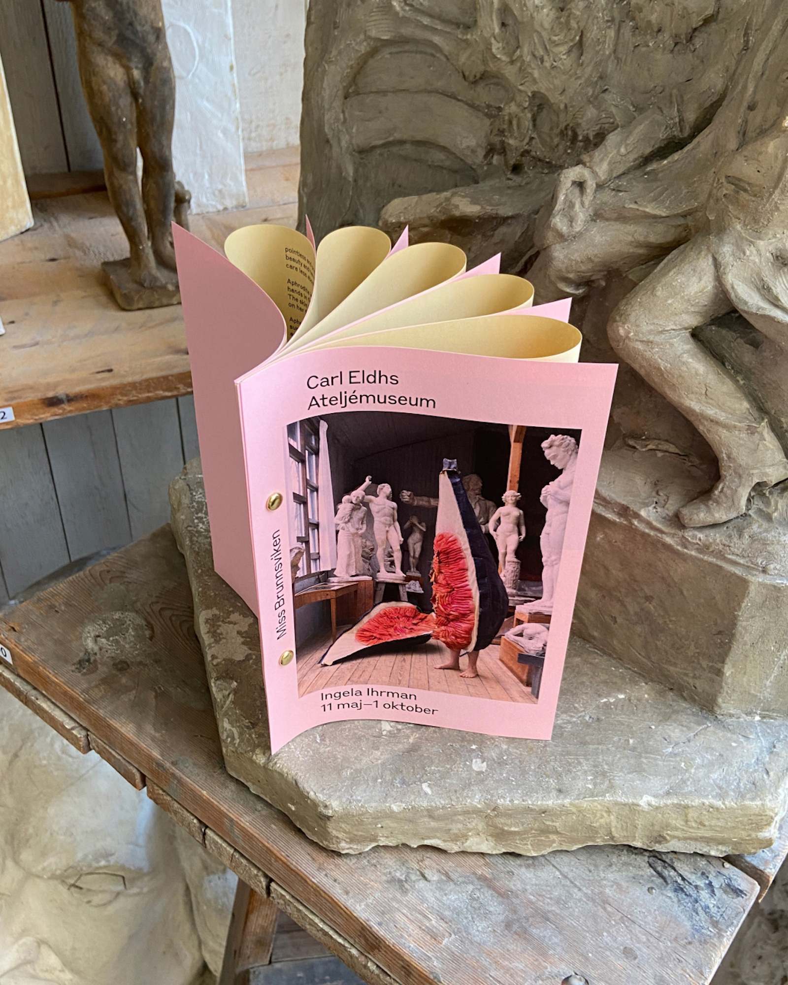 – Inledningsvis kollade vi på de tilltänkta verken, processen, arkivmaterial, sammanhanget med huset och trädgården, och försökte hitta en känsla som kändes rätt för alla. Jag satt och vred och vände på vikta A4-ark när jag hittade ett sätt att få volym genom att böja arken istället för att vika dem. Resultatet blev blomliknande former som kändes passande både för Ingelas verk – som ofta tar form av stora växter och blommor som blir kostymer och skulpturer – samt som referens till trädgården runt ateljémuseet.