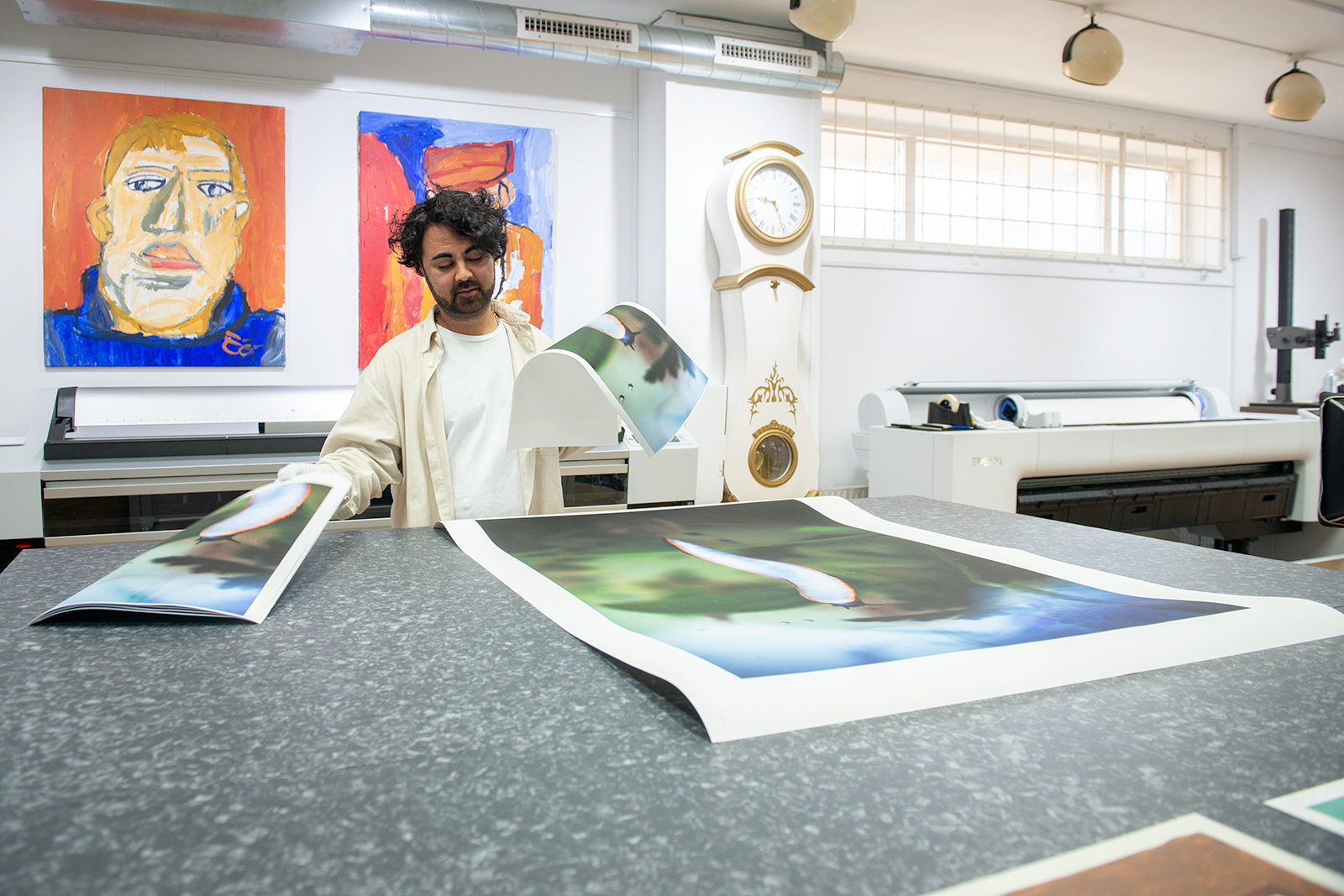 – Vi märker skillnad för orange är en svår färg att reproducera. Den kan sticka åt rött och vara svår att hantera. Det tycker jag hjälper jämfört med den andra skrivaren som saknade den. Kollar vi bara vad vi har på väggarna här så tycker folk om att måla med orange och brunt som också är svårt. Mitt jobb är att göra det så likt som möjligt, säger Youcef Salinas Samo.