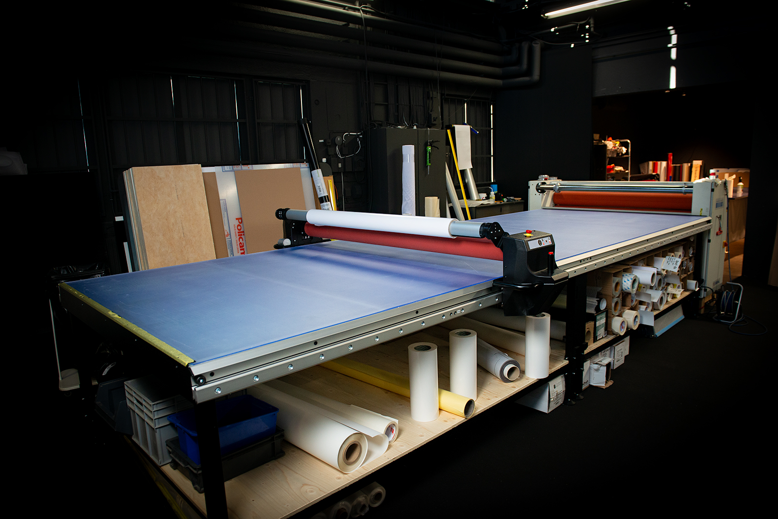 De använder bordet mest för montering och skärning, men även för vissa lamineringsarbeten. Utskrifter från UV-skrivaren lamineras dock i en annan maskin som har värme, eftersom det krävs för den typen av laminat och UV-utskrifter.