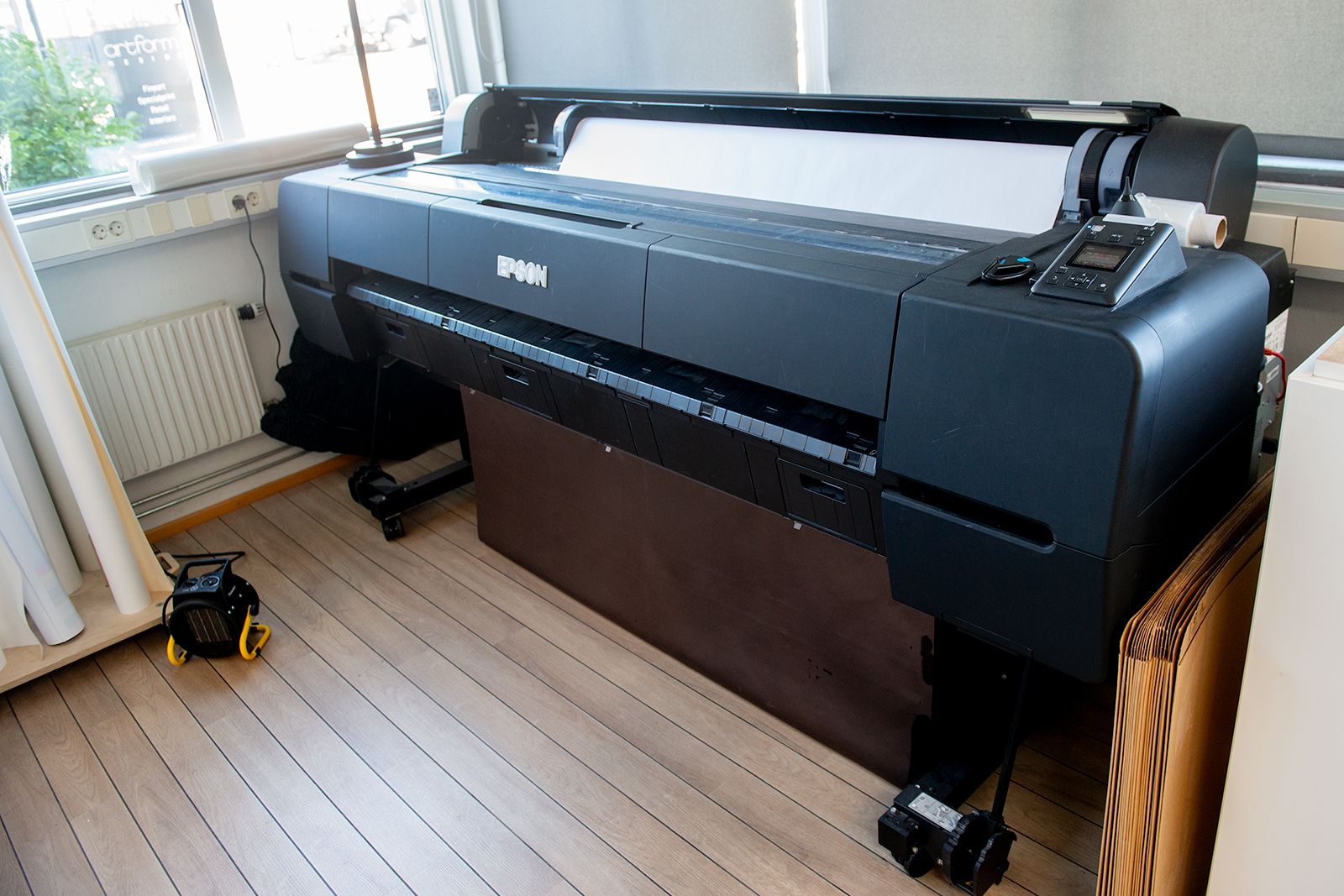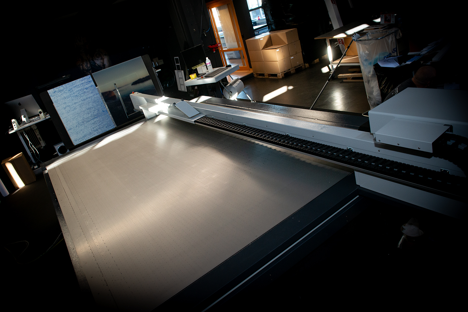 I ateljén bygger de ljuslådor, printar och efterbehandlar. De började med Kodakskrivare för papper, men har också haft olika solventskrivare och en skrivare från Zünd, som egentligen är kända för sina skärbord.