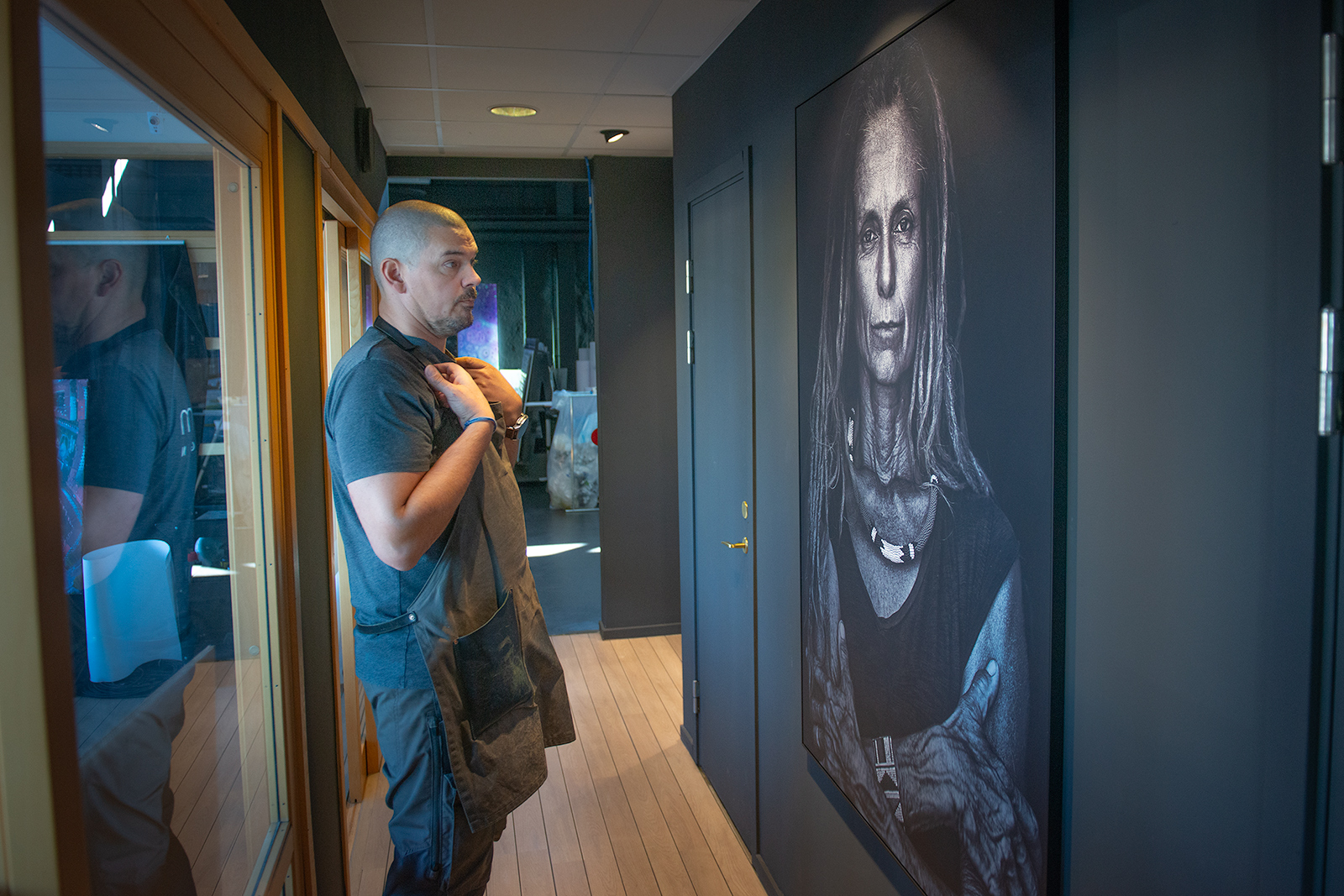 – Inredningsproduktionen innefattade bilder som gjort att vi började med olika skrivare. Vi har haft Epson-, HP-, Roland- och Zündskrivare som tidigare tillgodosett det vi har gjort i Volvohallarna. När de ville ha tygbilder köpte vi en stor textilprinter. När de inte längre vill ha det sålde vi den och skaffade en planprinter för då ville de ha utskrifter på plexi istället, säger Johannes Borg.