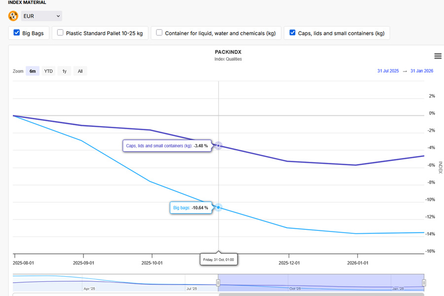 Bilden visar en beskuren skärmdump. Här visas utvecklingen för PP under de senaste 6 månaderna inom områdena Big Bags, förlutningar, lock och mindre behållare. Det finns fler val av produkter att göra, och dessutom så klart finns även prisutvecklingen för råvaran.