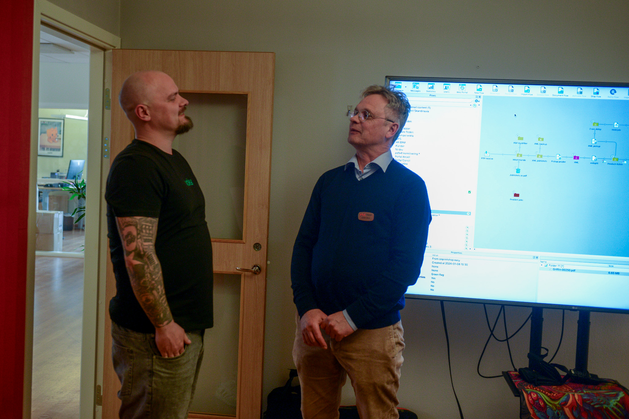 I ett konferensrum visade Thomas Lundgren och Joakim Münz hur de kan sätta upp smarta arbetsflöden med Enfocus Switch från webbeställningar till leverens. Man kan skapa precis de arbetsflöden man behöver.