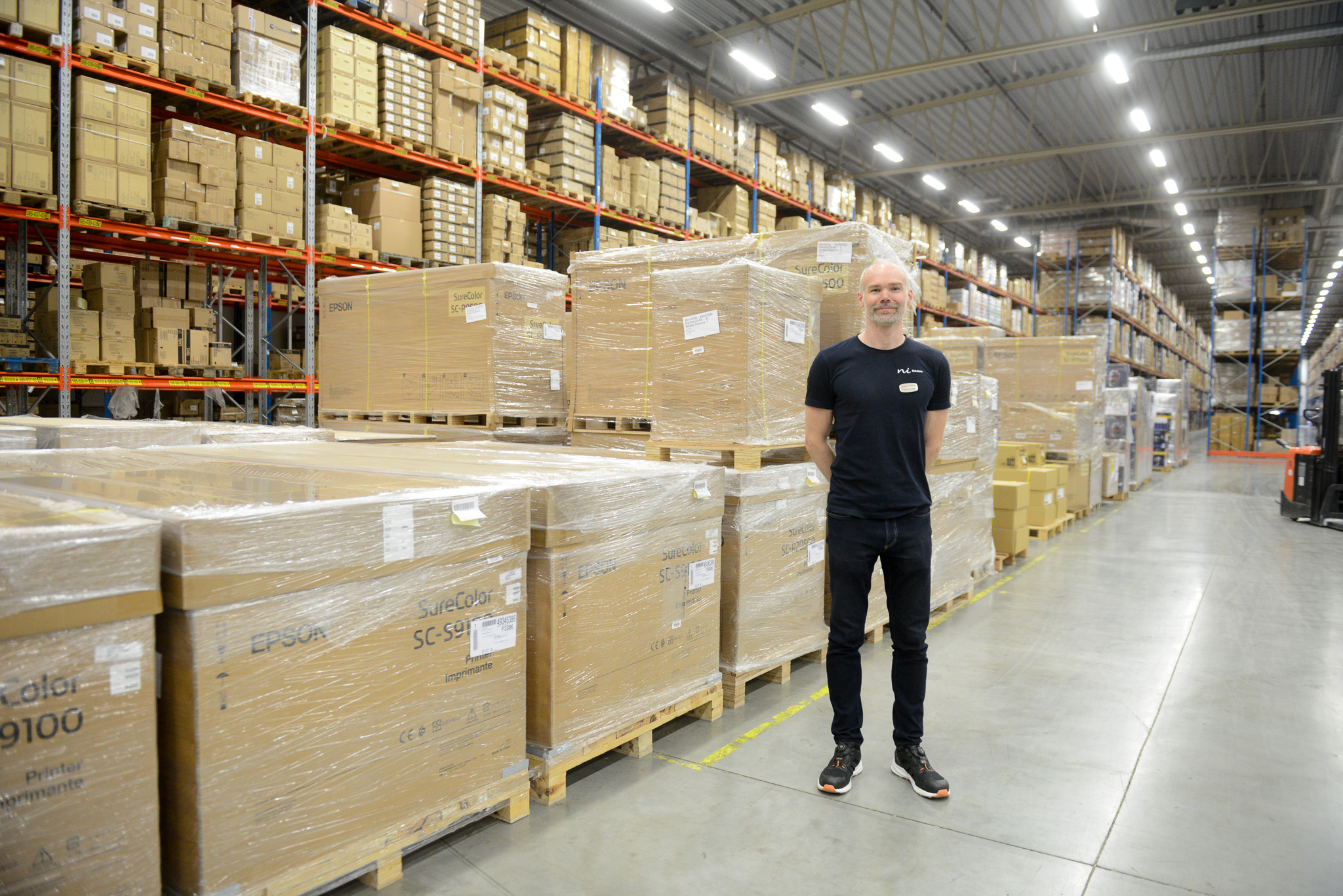Rickard Hansson, produktspecialist på NI Solutions, vid lagret av Epsonskrivare på Tura Scandinavia.